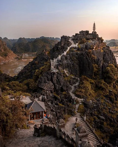 Đến Hang Múa, du khách sẽ nhìn thấy ngọn núi hình quả chuông lớn úp ngược, rộng khoảng 800m2. Từ phía dưới chân núi có thể thấy rõ được những bậc đá trắng dẫn lối đến đỉnh núi – những bậc thang nối nhau giống như Vạn Lý Trường Thành thu nhỏ.