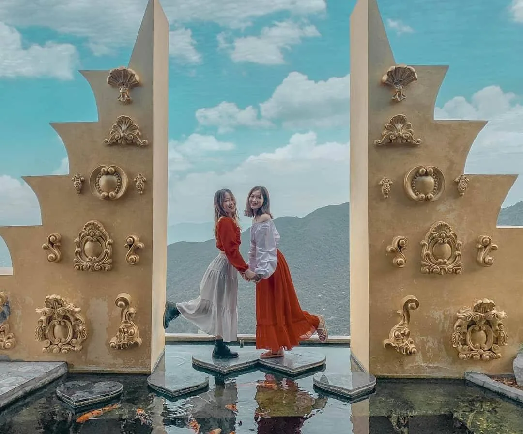 ⛩ 5h: Dậy siêu sớm, tụi mình makeup, chuẩn bị đồ và 6h lên Cổng trời hướng khách sạn Venus thẳng lên 2km. Thực ra là một quán cafe họ xây 1 vài view xinh xinh (cổng trời, tay phật,…) phục vụ khách du lịch. Chỗ này cũng siêu đông nên nếu không muốn xếp hàng chụp thì qua sớm sớm nhé.