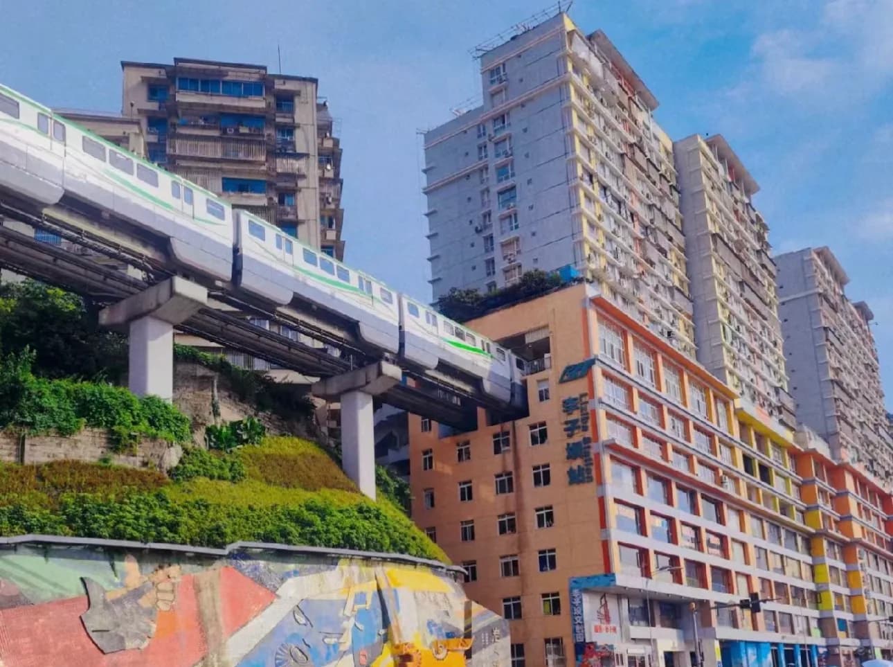 - Tham quan (bên ngoài) Ga tàu trên không xuyên các toà nhà ở trung tâm thành phố Trùng Khánh: Đường sắt trên cao đi xuyên chung cư và một bến tàu được bố trí ngay trong lòng tòa nhà chính là nét đặc trưng hiếm có của thành phố được bao bọc bởi sông và núi này. Do vậy, bất kể là ngày hay đêm, đây luôn là điểm check-in “cực hot” đối với du khách.