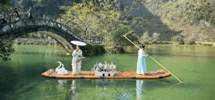 14h00: Hướng dẫn viên Trung Quốc sẽ đón đoàn tại cửa khẩu Long Bang, làm thủ tục nhập cảnh. Xe và hướng dẫn viên đón đoàn thăm quan khu du lịch Nga Tuyền. Suối Nga Tuyền, đây còn là một trong ba con suối nổi tiếng nhất Tây Nam Trung Quốc. Nếu những ai yêu thích phong thái cổ trang Trung Quốc thì không nên bỏ qua địa điểm suối Nga Tuyền, đây có lẽ là một trong những điểm du lịch gần Việt Nam nhất của Trung Quốc và được xây dựng kiến trúc cầu bắc ngang, lầu các… đậm nét cổ phong Trung Hoa. Đây chính là địa điểm để bạn tạo ra những bức ảnh hoài niệm tuyệt với không kém gì Phượng Hoàng Cổ Trấn. Quý khách khám cũng có thể trải nghiệm đi trên bè tre để chiêm ngưỡng vẻ đẹp của sông Nga Tuyền (chi phí tự túc (10 NDT/1 khách)