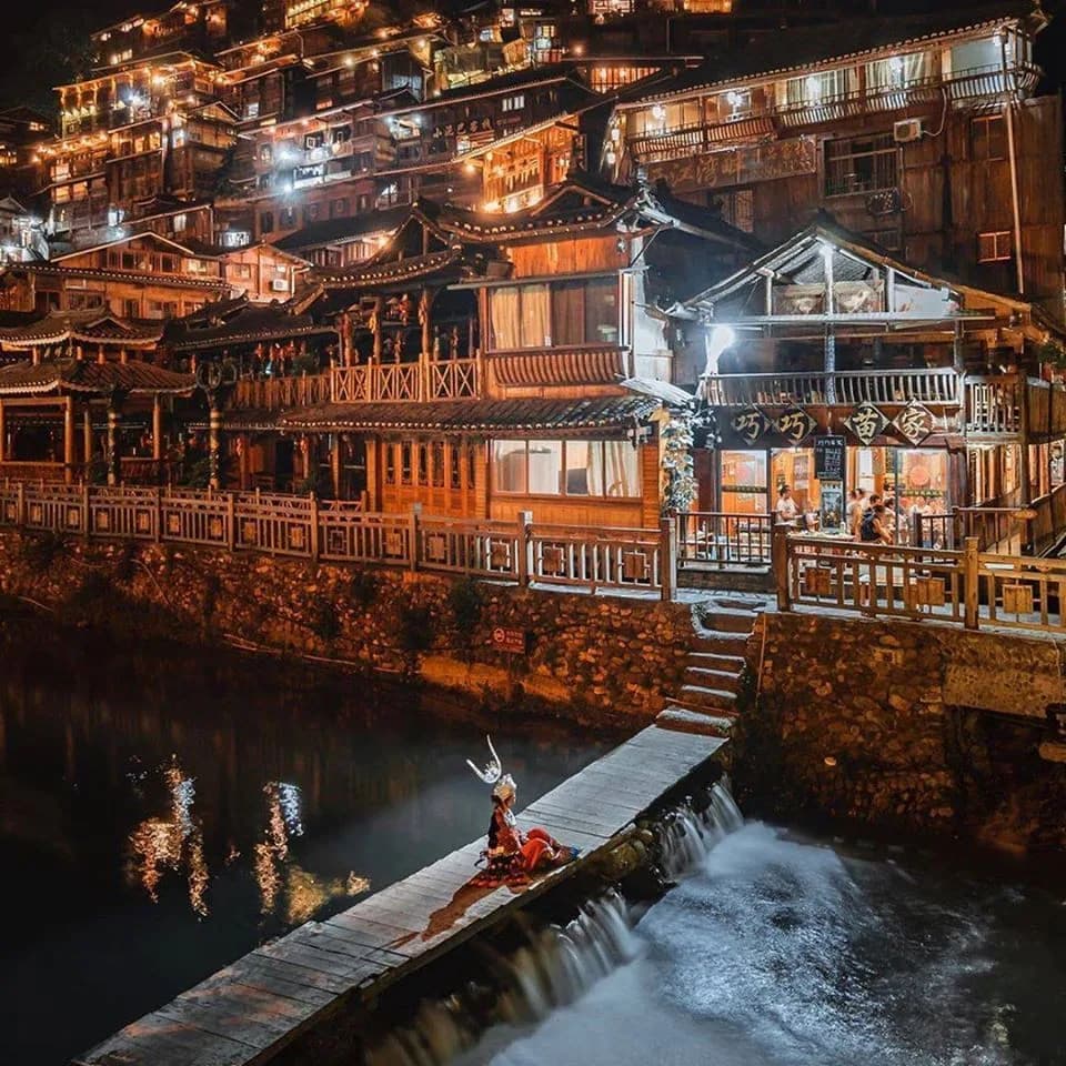 • Sau bữa tối quý khách dạo bộ ở thị trấn. (Một trong những thị trấn văn hóa lịch sử nổi tiếng Trung Quốc, còn được gọi là "Thị trấn cổ Thái Cực", Trấn Viễn cổ trấn có non nước quanh co, phong cảnh mê người, Trấn Viễn là một bức tranh, là một bức tranh thủy mặc "mộc mạc trung kiến quý kỳ, thanh nhã trung hiển thần vận")